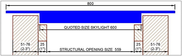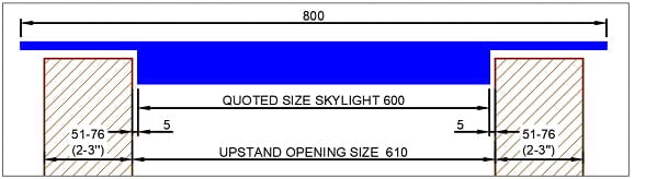 Une inclinaison minimale de 8 à 10 degrés par rapport à l'horizon doit être prévue pour éviter que l'eau ne s'accumule au milieu du panneau de verre (pour chaque mètre de lanterneau, une chute de 10 cm est nécessaire). Il vaut la peine de prendre quelques minutes supplémentaires avant d'appliquer le silicone pour effectuer un test d'eau afin de s'assurer que l'eau ne s'accumule pas (même si vous installez du verre, il se pliera toujours au milieu). La distance interne entre les montants doit être supérieure de 10 mm à la taille de la lucarne indiquée (dans notre exemple : 610 mm par 610 mm).