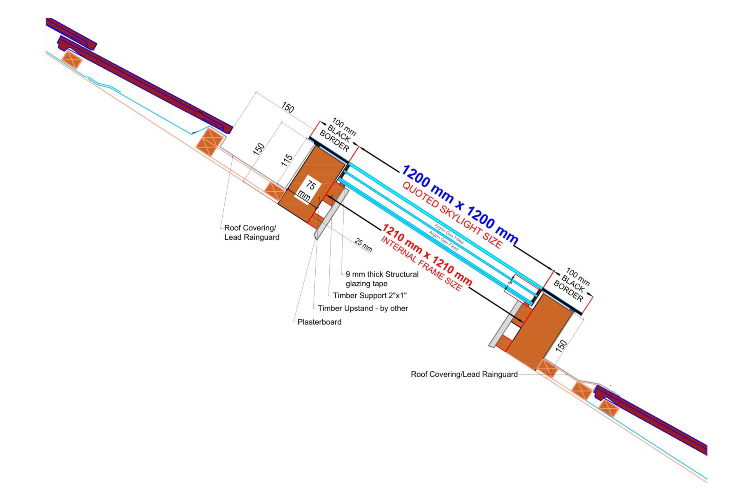 N'oubliez pas que les dimensions de nos puits de lumière sont celles du panneau de verre inférieur (interne). Le panneau supérieur est décalé de 100 mm de chaque côté, et la taille totale visible de l'extérieur est supérieure de 200 mm dans les deux sens :