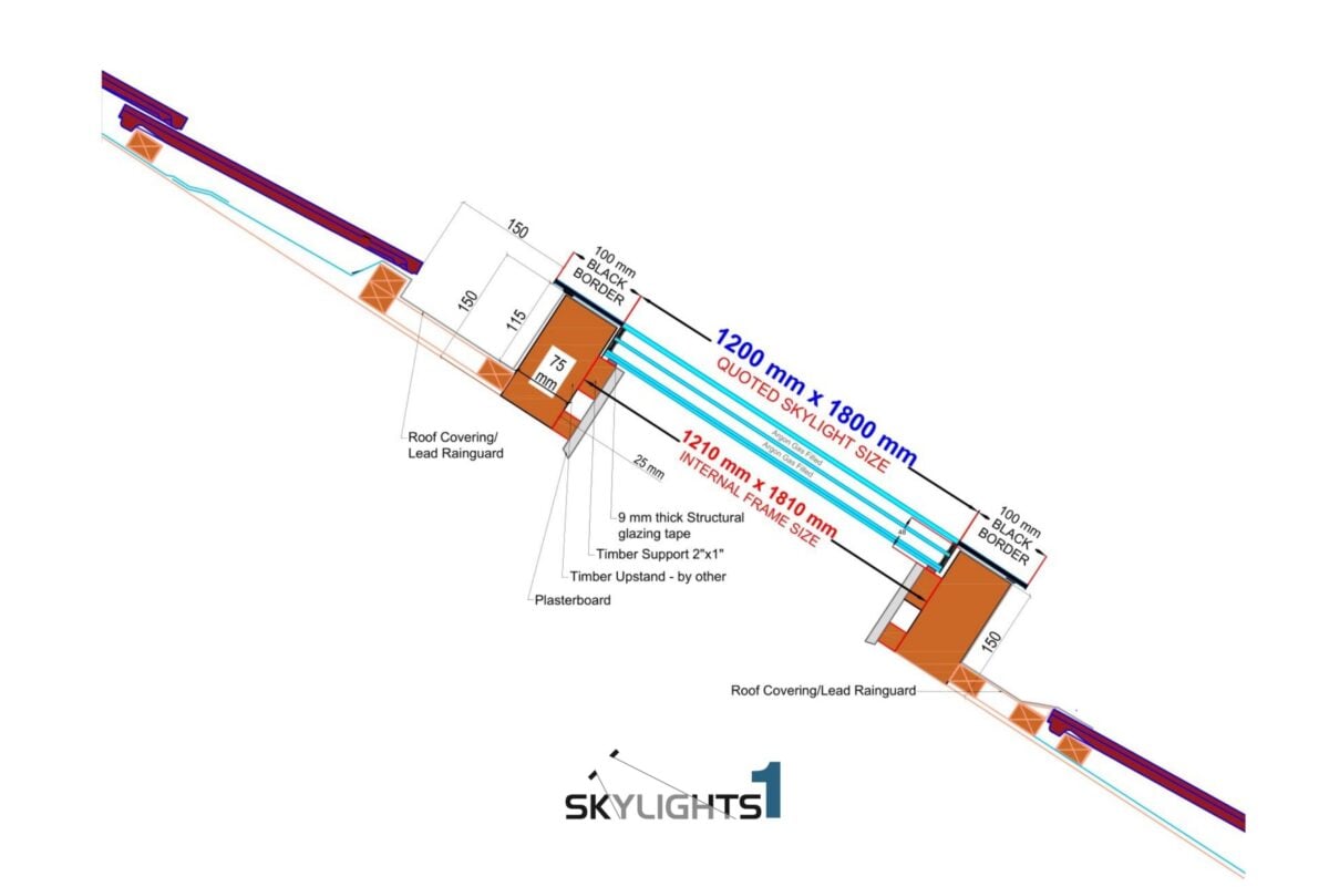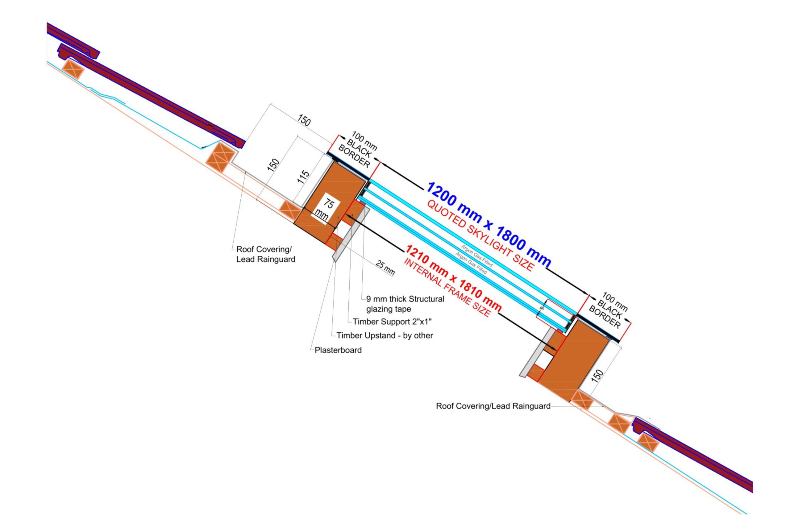 Cette fenêtre de toit sans cadre à haute performance et sans ouverture est dotée d’un triple vitrage avec un verre trempé autonettoyant de 6 mm et une valeur U de seulement 0,9 W/m²K. Les dimensions intérieures du verre sont de 120 x 180 cm, voir le schéma structurel ci-dessous.