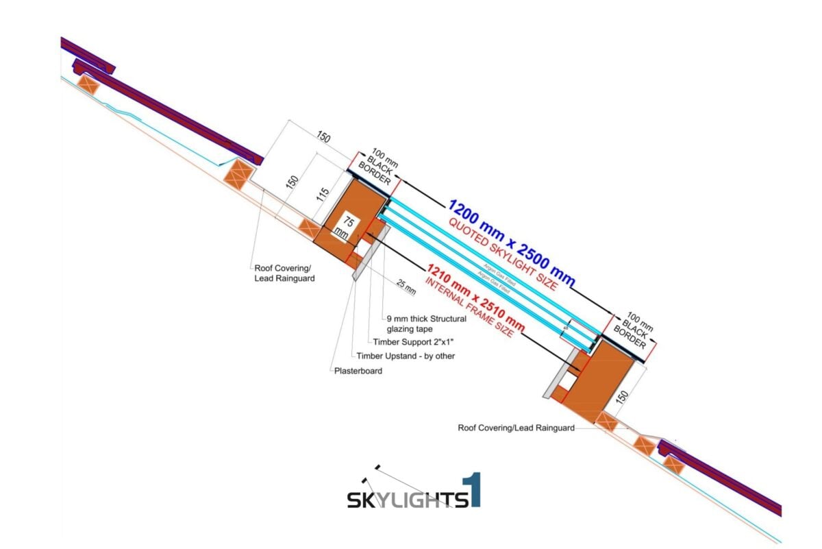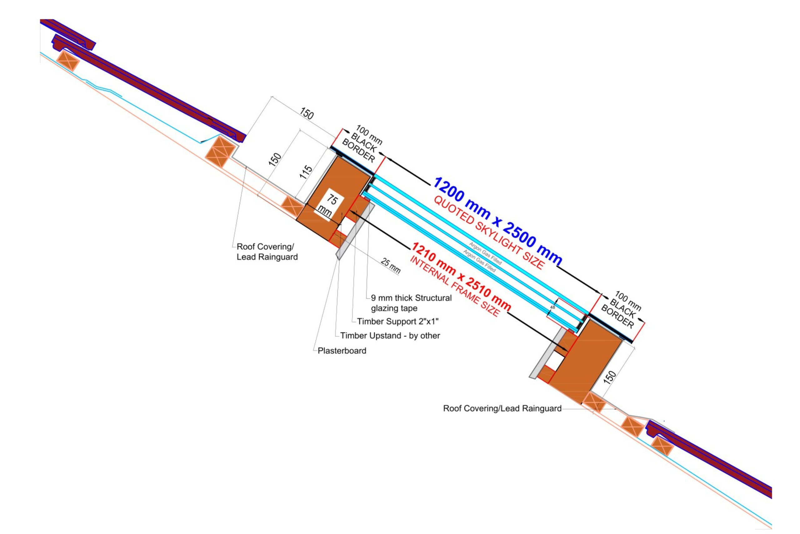 N'oubliez pas que les dimensions de nos puits de lumière sont celles du panneau de verre inférieur (interne). Le panneau supérieur est décalé de 100 mm de chaque côté, et la taille totale visible de l'extérieur est supérieure de 200 mm dans les deux sens :