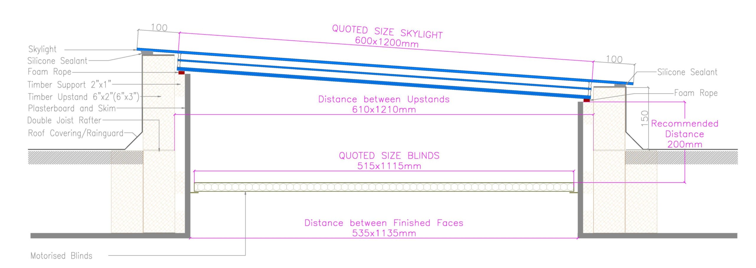 N'oubliez pas que les dimensions de nos puits de lumière sont celles du panneau de verre inférieur (interne). Le panneau supérieur est décalé de 100 mm de chaque côté, et la taille totale visible de l'extérieur est supérieure de 200 mm dans les deux sens :